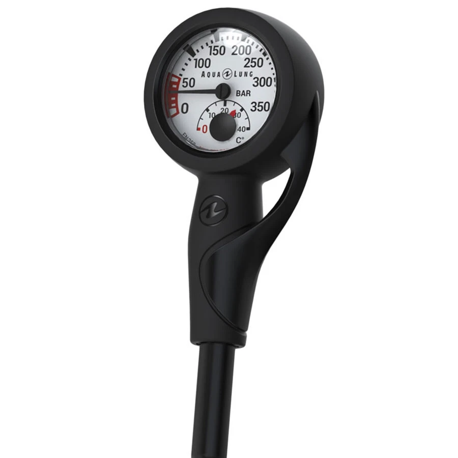 Le manomètre de pression Aqua Lung indique à la fois la pression d’air restante et la température, sur un seul affichage facile à lire.