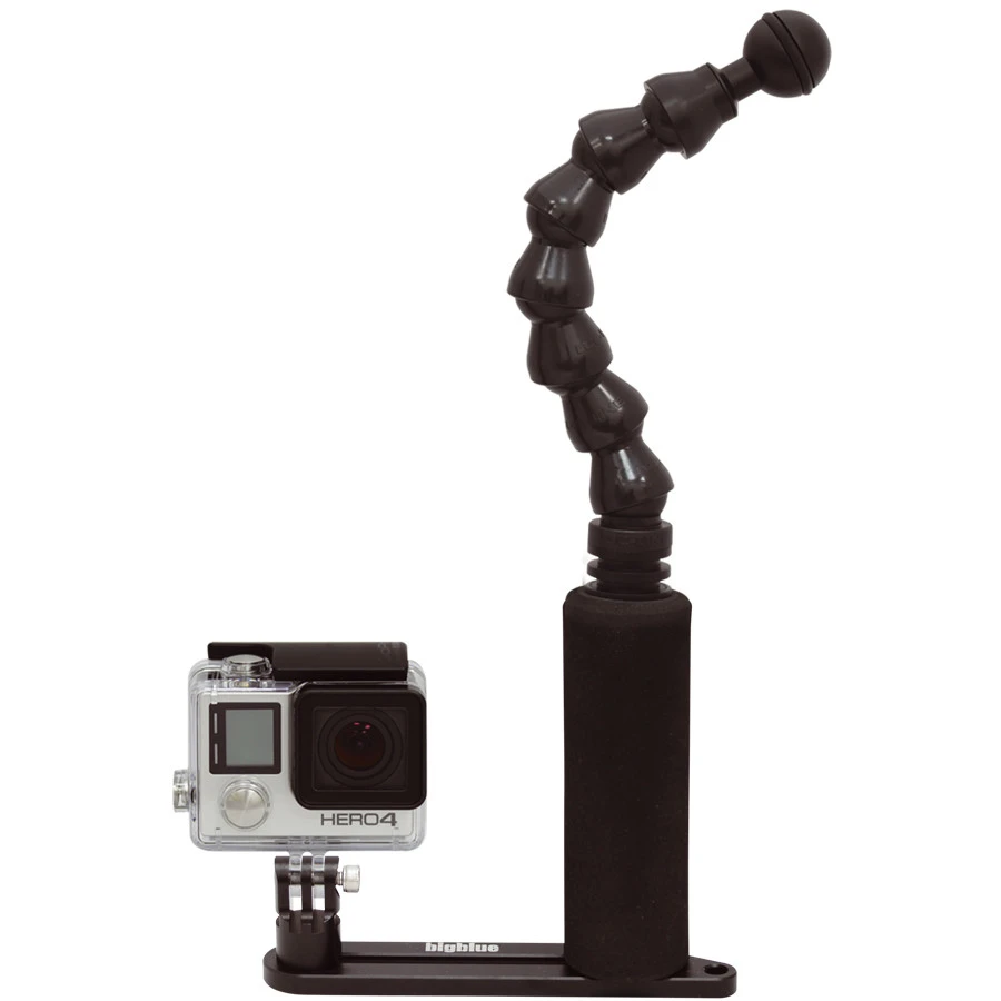 Petite platine avec 1 poignée matelassé (mousse), 1 bras flexible de 18cm avec terminaison type boule 25mm, et une fixation Tripod type GOPRO.